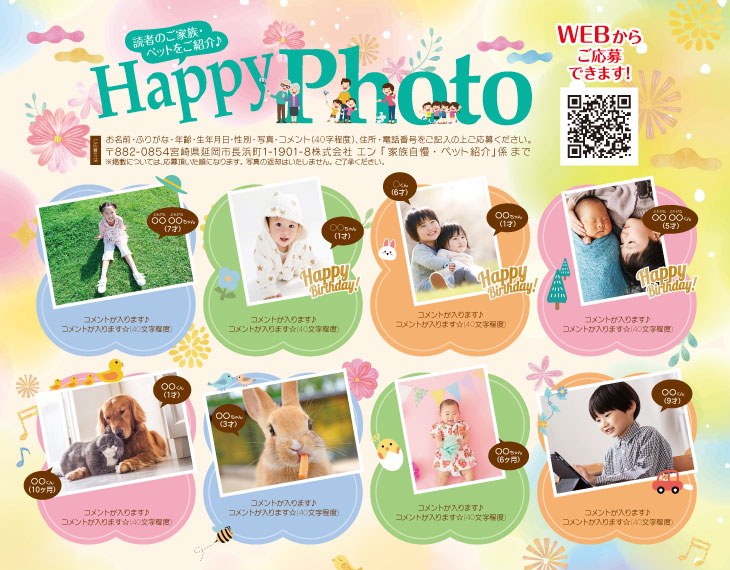 “今月のHappy Photo”応募受付 2025.09.262022.10.20 東九州マガジンen.をご愛読いただき、誠にありがとうございます。「今月のHappy Photo」コーナーで読者のご家族やペットをご紹介♪掲載ご希望の方は下記フォームよりご応募ください。 記事見本はこちら 掲載について 掲載についてはご応募いただいた順になります。次号の掲載となる場合もあります。 お名前・ふりがな・年齢・生年月日・性別・写真・コメント(40文字程度)・電話番号・メールアドレスを下記フォームよりお送りください。 掲載月がお誕生日の方はHappyBirthdayマークをお付けしています。お付けする際は下記フォームにチェックを入れてください。 写真に複数名写っている場合は、お名前の指定を備考欄にご記入ください。 掲載料無料です! 掲載内容を以下のフォームにご入力ください。 Ⓐ掲載するお子様・ペットなどのお名前 Ⓐふりがな Ⓐ性別をお選びください。 男の子女の子 Ⓑ年齢 Ⓑ生年月日 Ⓒコメント(10字以上40文字程度:残り43文字) Ⓓ写真を送信される場合は、ファイルを選択してください。(画像サイズは10MBまで) ⒺHappyBirthdayマークは入れる際はチェックを入れてください。 HappyBirthdayマークを入れます。 備 考 掲載に関してのご連絡先を以下のフォームにご入力ください。 申込者名 電話番号 送信確認用メールアドレス Δ